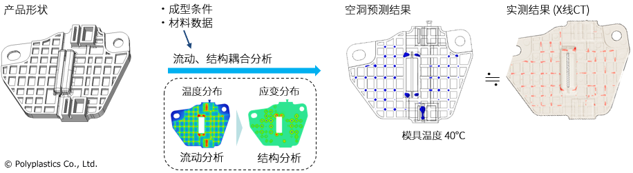 此次开发的新技术是一种全新的方法,其通过流动分析与结构分析的耦合,考虑了树脂固化过程的收缩率、弹性模量与压力的分布,根据成型产品内部产生的应变来预测空洞的产生。由于可以在开模之前高精度地预测空洞的产生,因此预期可以缩短开发周期,降低制造与开发成本,减少实施模拟所需的能耗。