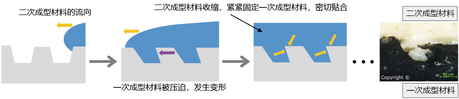 在成型过程中,二次成型材料树脂的收缩会对一次成型材料树脂产生抱合力。